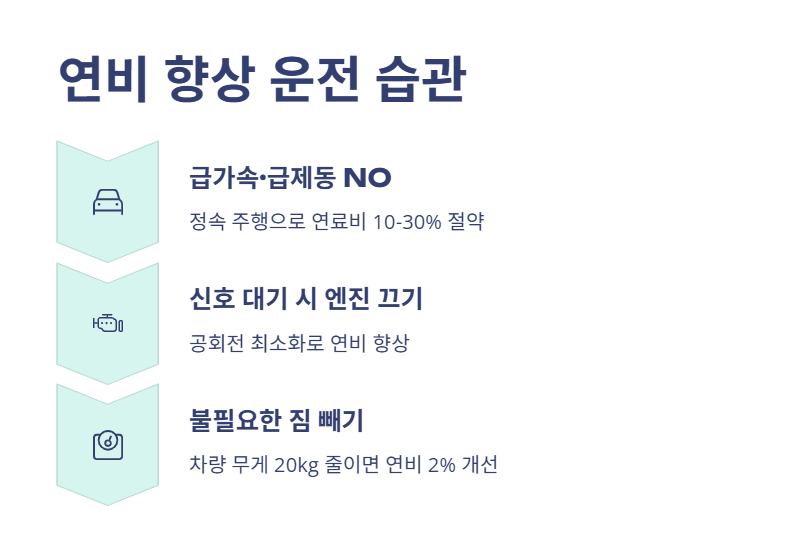 급출발, 급가속, 급제동을 피하고, 신호 대기 시 엔진을 끄면 연비가 10~30% 향상됩니다. - 불필요한 짐을 빼고, 공회전 최소화도 연료비 절감에 큰 효과!