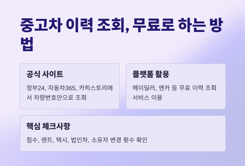 헤이딜러, 엔카 등 주요 플랫폼의 무료 이력 조회 서비스도 적극 활용하세요.